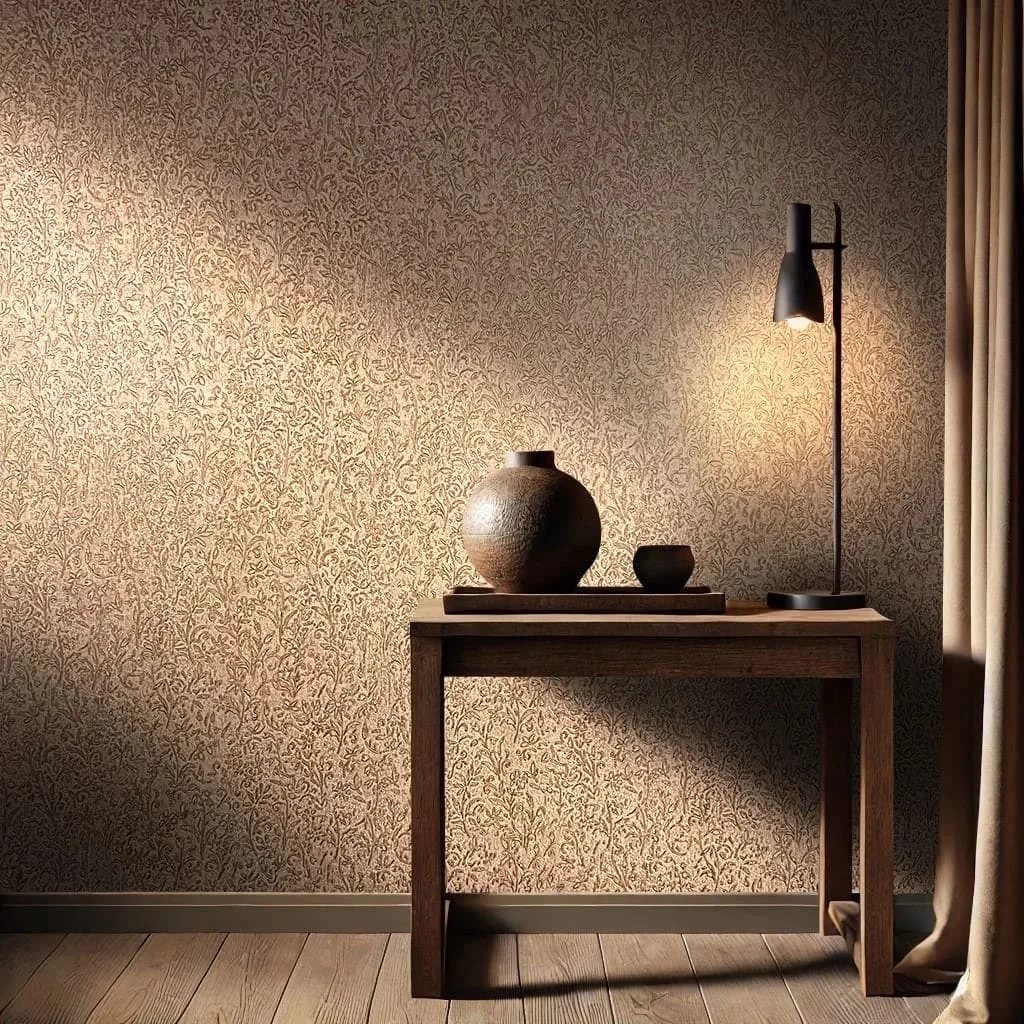 Give your walls a touch of vintage romance: this wallpaper combines a delicate floral relief with elegant gold accents on a patinated background. Ideal for stylish interior design with classical elegance and artistic character.